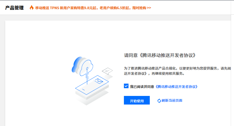 到腾讯云的 TPNS移动推送页面,点击页面里的“立即使用”即可。