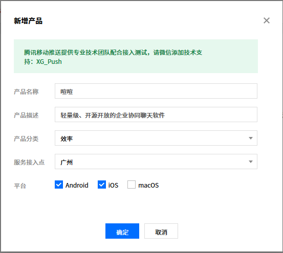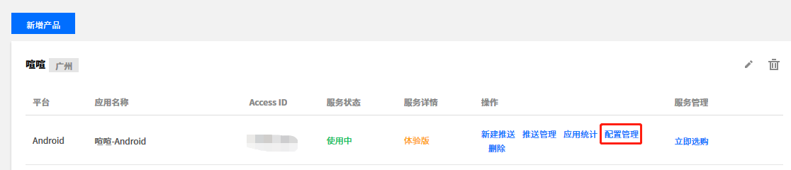 下面给大家具体介绍Android端的喧喧APP推送的配置。Android的推送,我们使用的是腾讯云的TPNS移动推送服务。需要注册登录腾讯云,到TPNS移动推送里把喧喧添加为新产品,这样可以获取到ACCESS ID、ACCESS KEY和SECRET KEY。