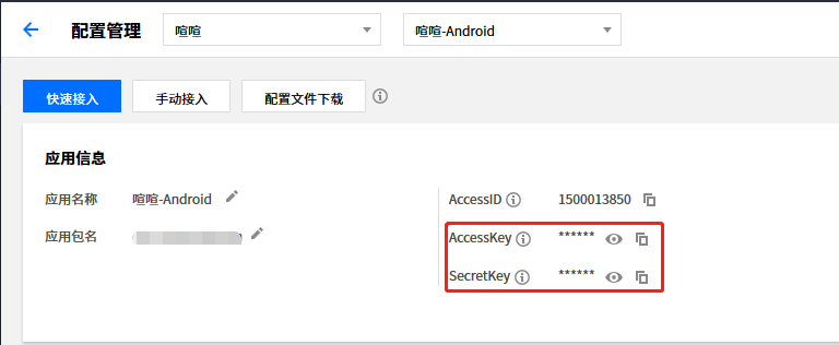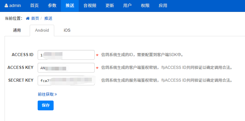 把这个ACCESS ID、ACCESS KEY和 SECRET KEY填写到后台--推送--Android里。