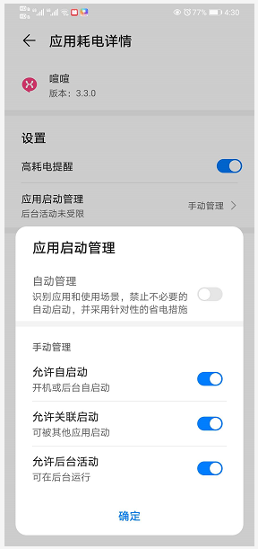 到设置→应用→喧喧→应用耗电详情,把应用启动管理由自动管理改为手动管理,允许自启动,允许关联启动,允许后台活动。