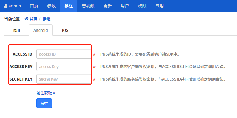 把ACCESS ID、ACCESS KEY和SECRET KEY填写到后台推送的Android推送设置里。