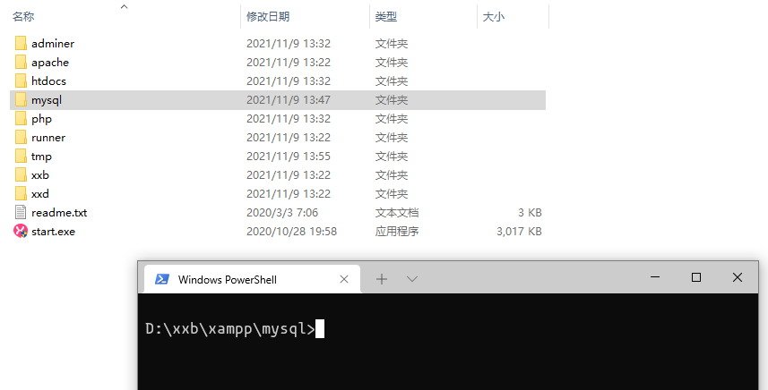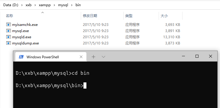 - 在启动喧喧集成运行环境和后端服务后,使用 cmd 或者 PowerShell 进入 mysql 目录:
