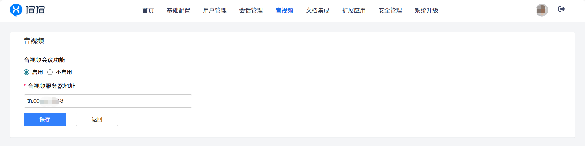 该功能默认是不启用的状态,开启后需要填写对应的音视频服务器地址,填写后保存即可。