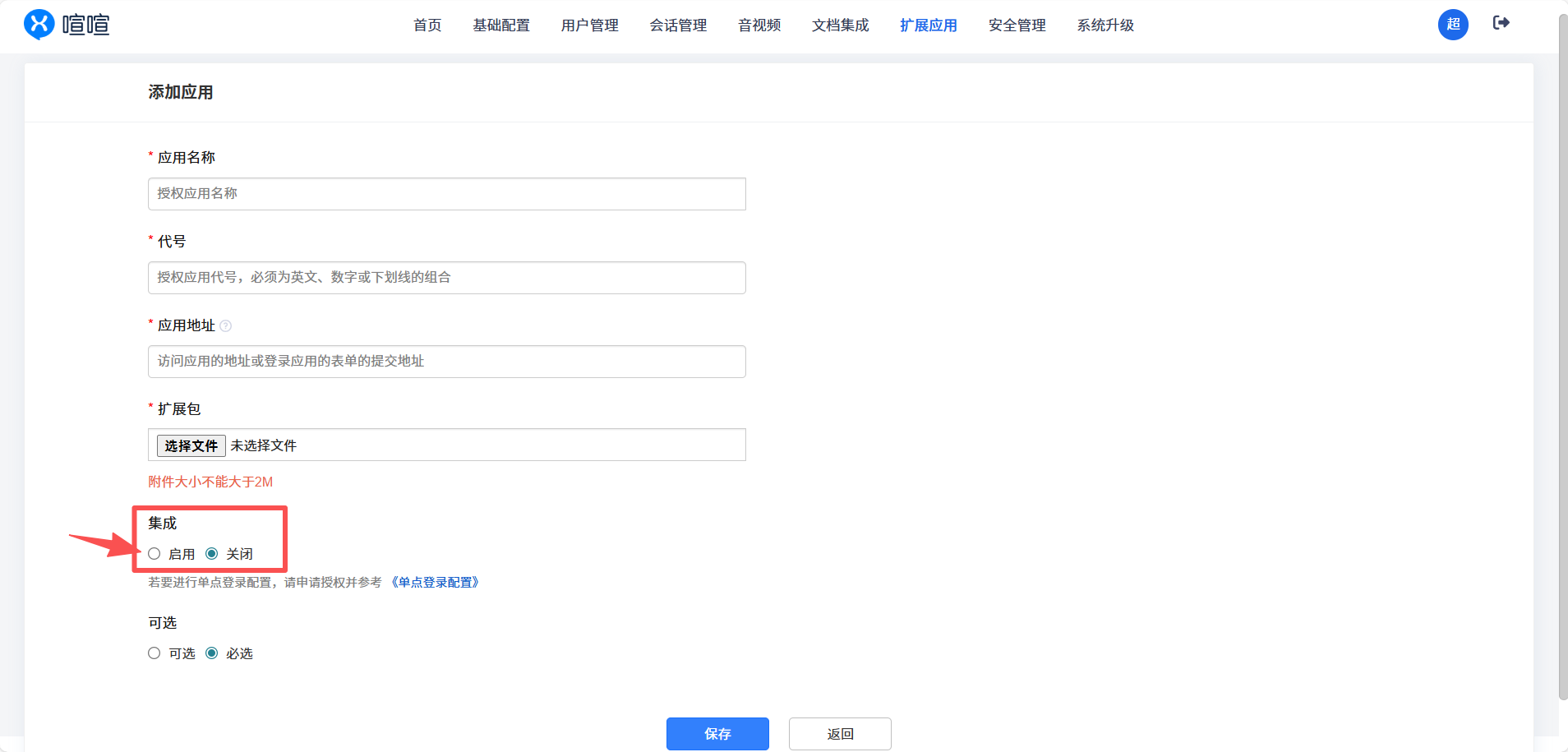 添加应用页面,如果需要启用应用,需要选中 集成中的 启动,否则应用添加成功后,默认是没集成的。