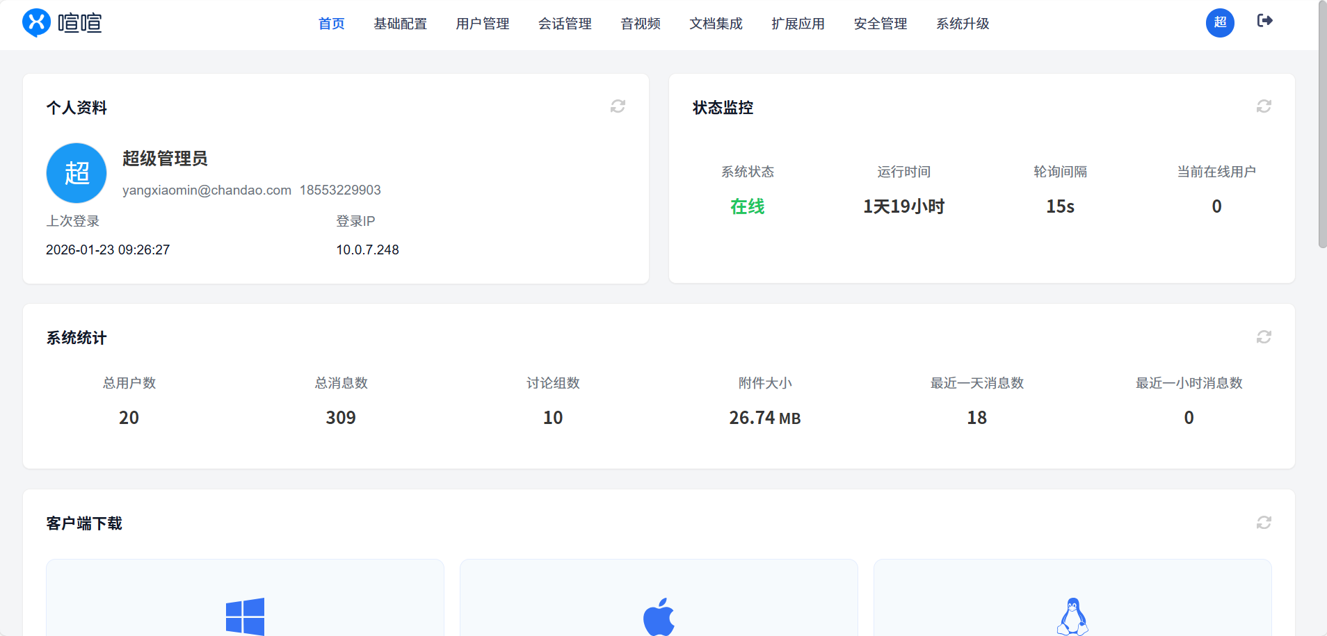 喧喧10.0版本正式上线,此次升级是喧喧历史上一次重大技术突破。 后端架构全面重构,迁移至FrankPHP平台并采用Go语言优化聊天接口,系统性能提升 2~5倍,稳定性与并发处理能力显著增强。 消息服务整合与部署流程大幅简化,新用户仅需安装XXD与客户端即可快速部署,安装成功率大幅提升。同时, 后台界面全面优化、数据库兼容性增强、功能完善与Bug修复,进一步提升用户体验与系统稳定性。喧喧10.0为企业级通信服务带来更高效、更智能的全新体验。