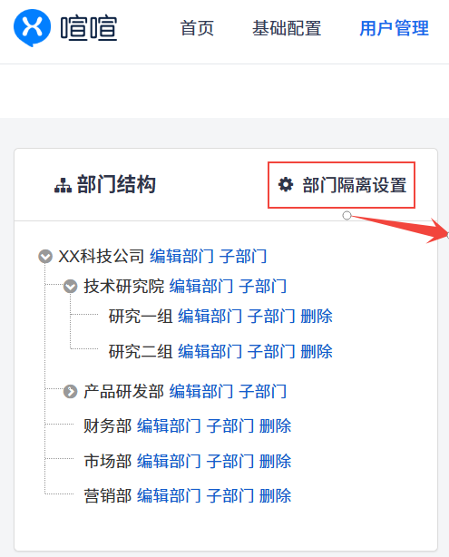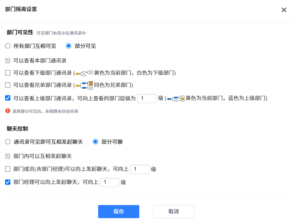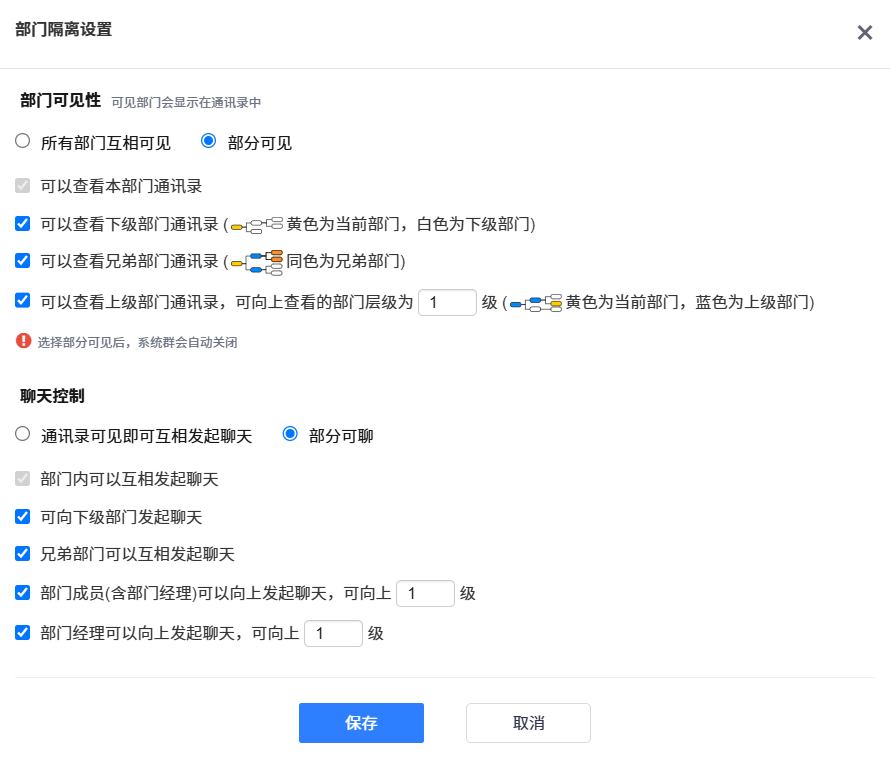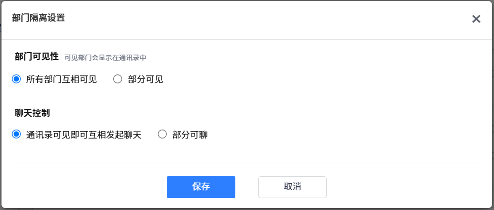 ▼后台部门管理增加部门隔离设置入口,设置项默认为所有部门互相可见、互相可聊。