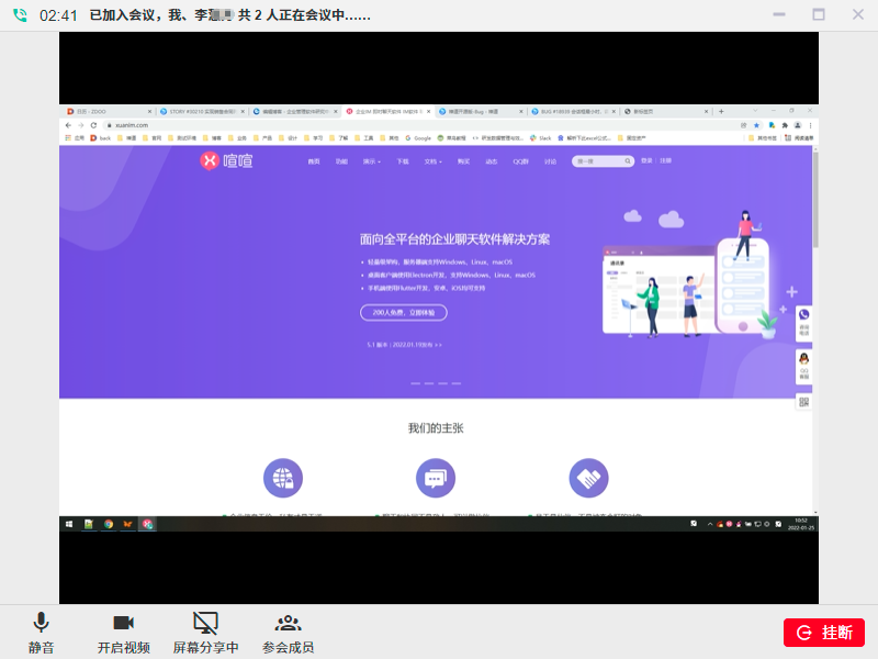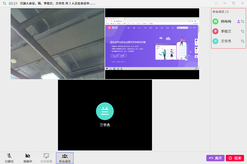 ▼ 适配SRS作为可选的音视频后端,可以分享屏幕、音视频,查看参会成员等。