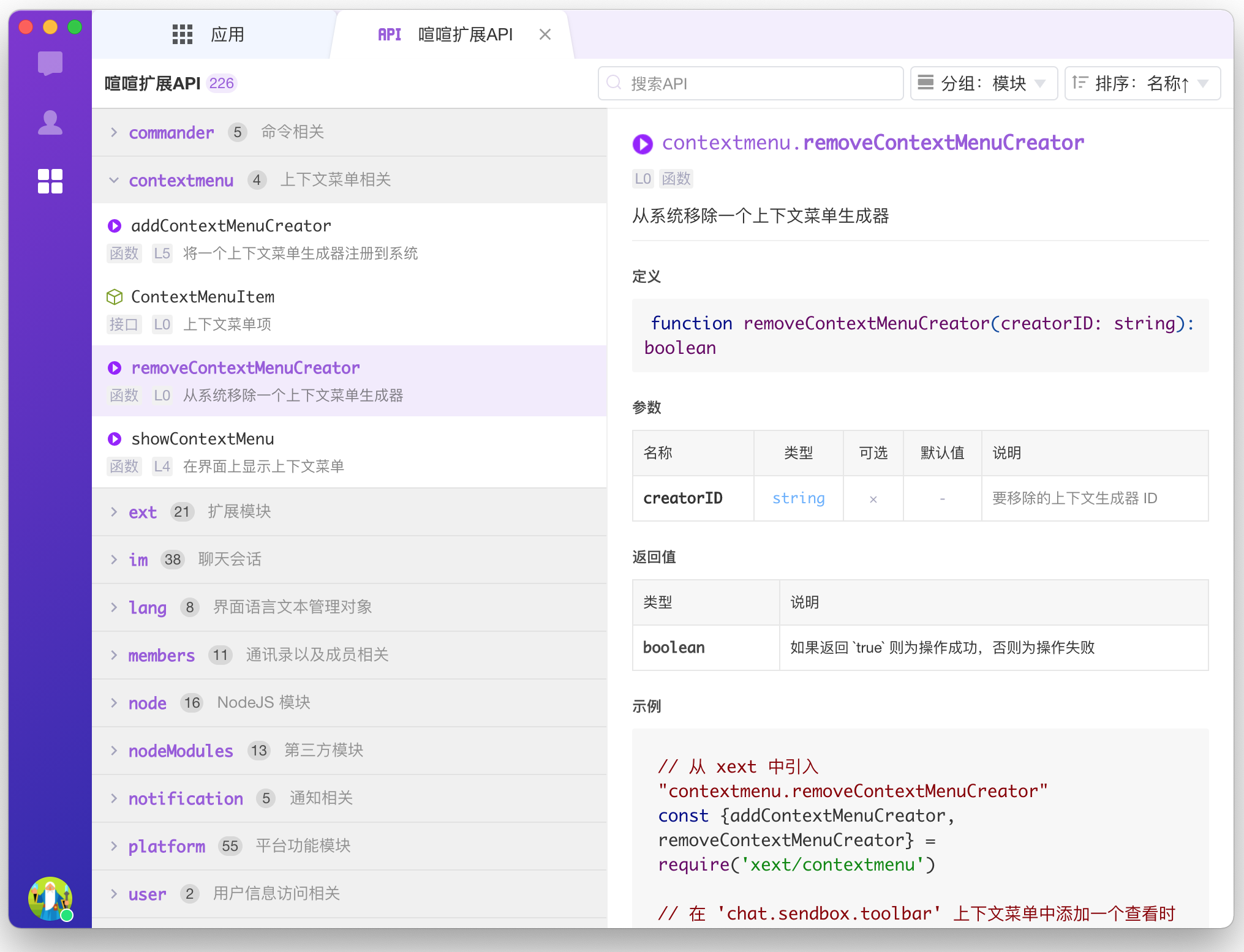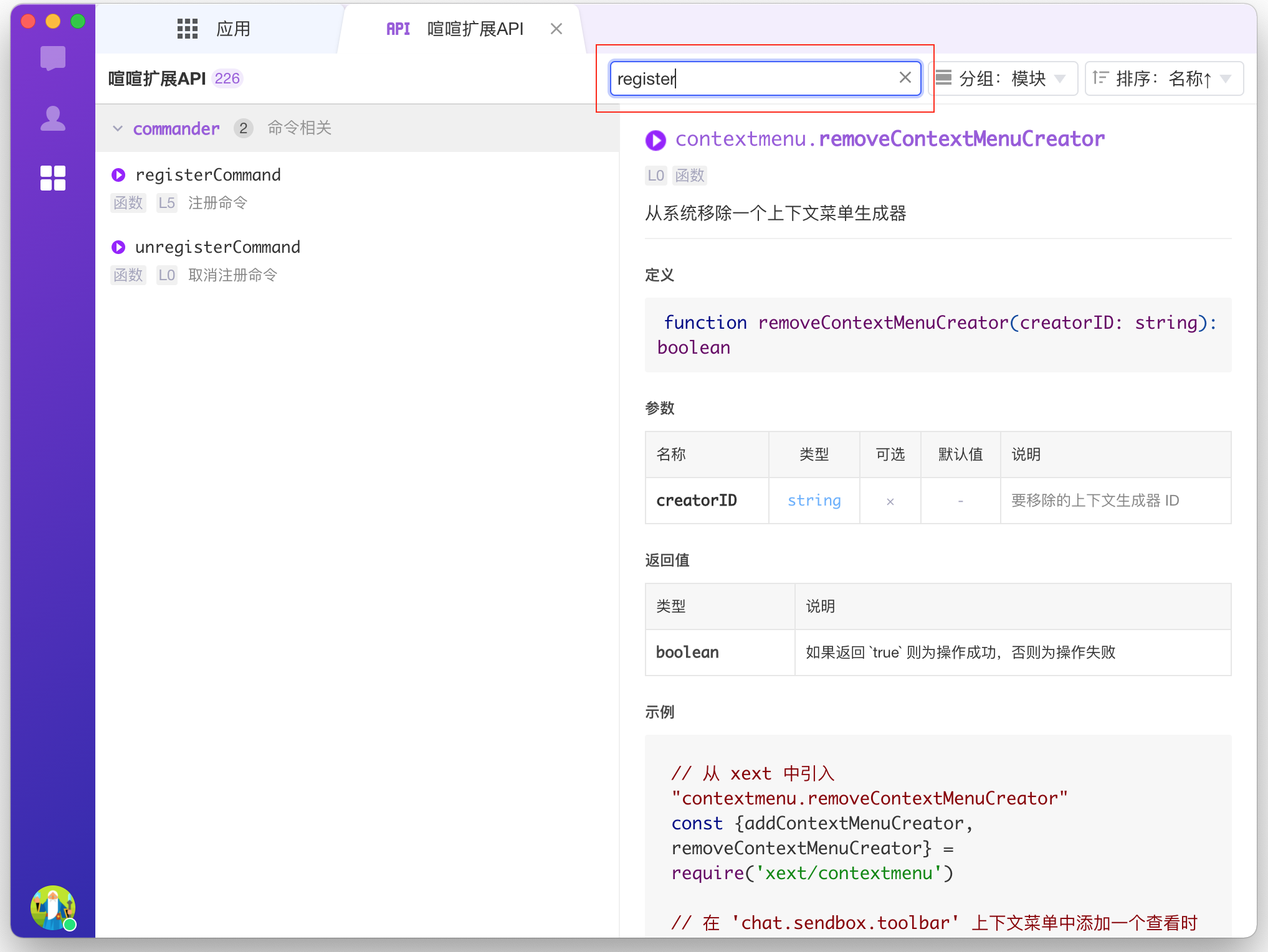 - 新增API应用,可以查看API的定义、参数、返回和示例,支持搜索API、按模块和级别分组、按名称和等级排序。