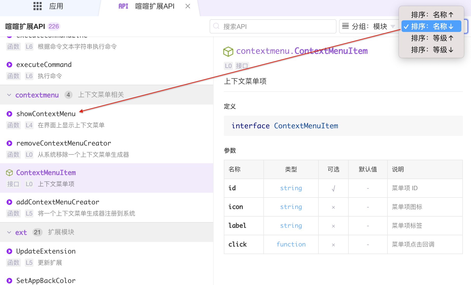 ▼ 可以按名称或者等级对API排序。