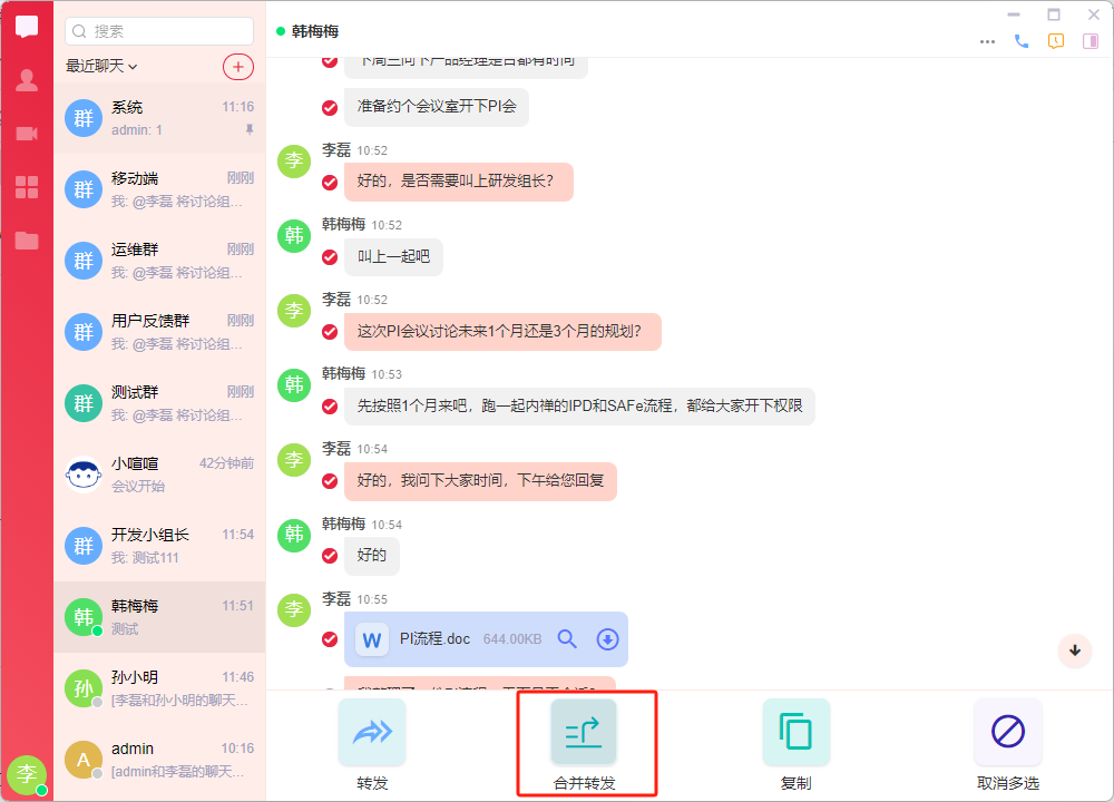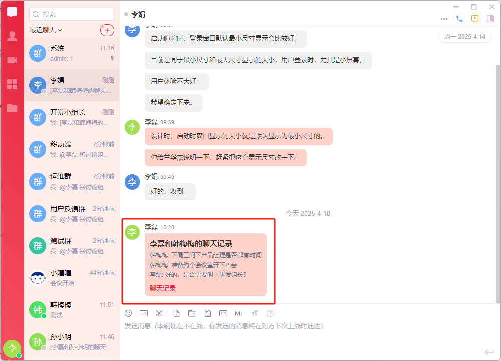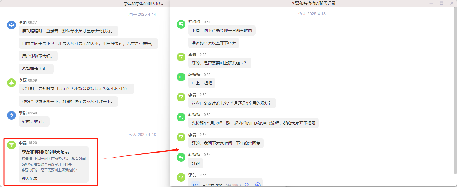 - 合并转发后的消息体以独立窗口查看详细的聊天记录。