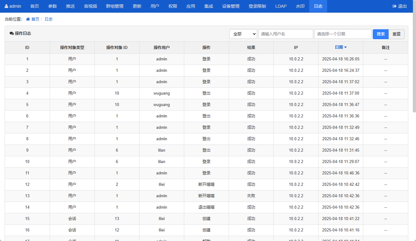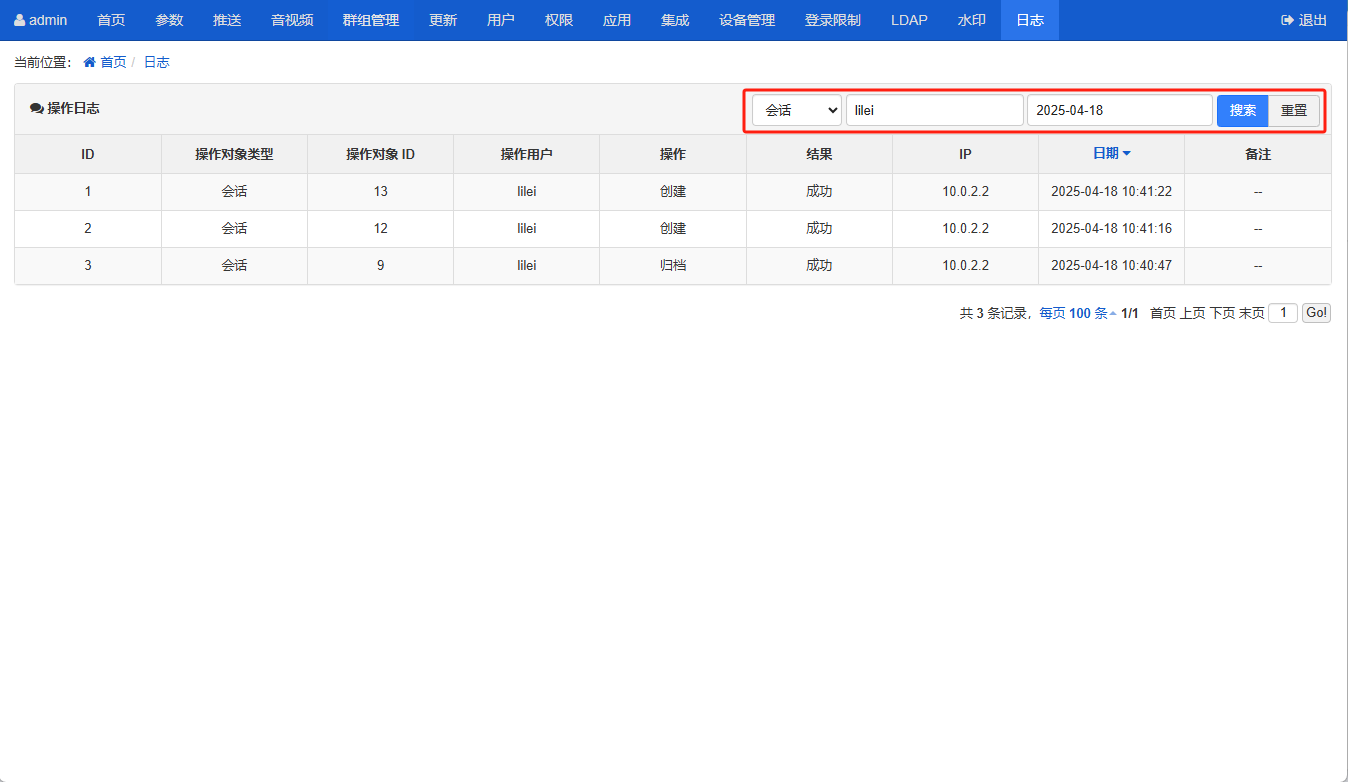 ▼ 后台增加日志管理模块,记录后台操作、登录动作、群操作等,支持按照类型、用户、日期条件检索。