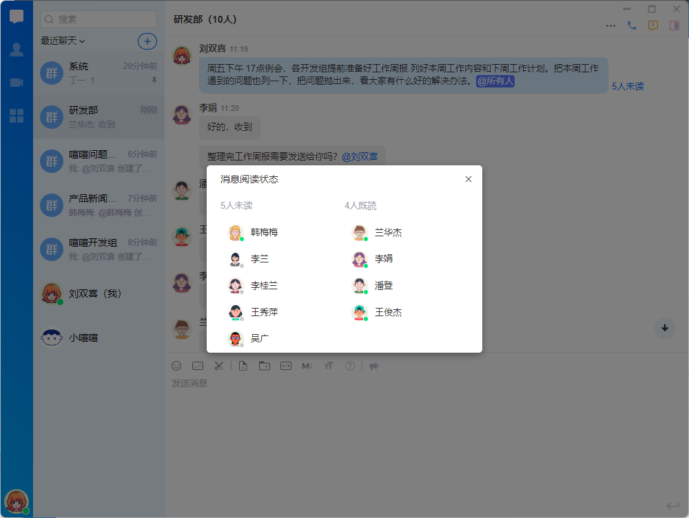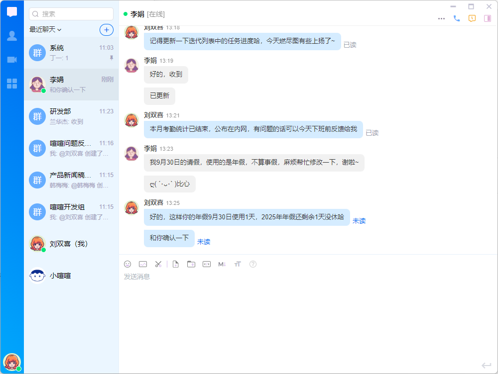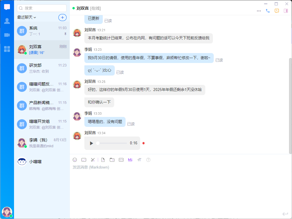 大家好,喧喧客户端和移动端9.5版本正式发布啦!这次更新带来了大家期待已久的 消息已读未读功能,支持快速查看消息的阅读状态,帮助团队及时跟进沟通进度,显著提升协作效率。同时,新版本还兼容了 语音消息的渲染及播放流程,不论是桌面端还是移动端,语音沟通更加清晰流畅。本次更新我们还修复了多项已知问题,进一步提升了系统的稳定性和整体用户体验。
