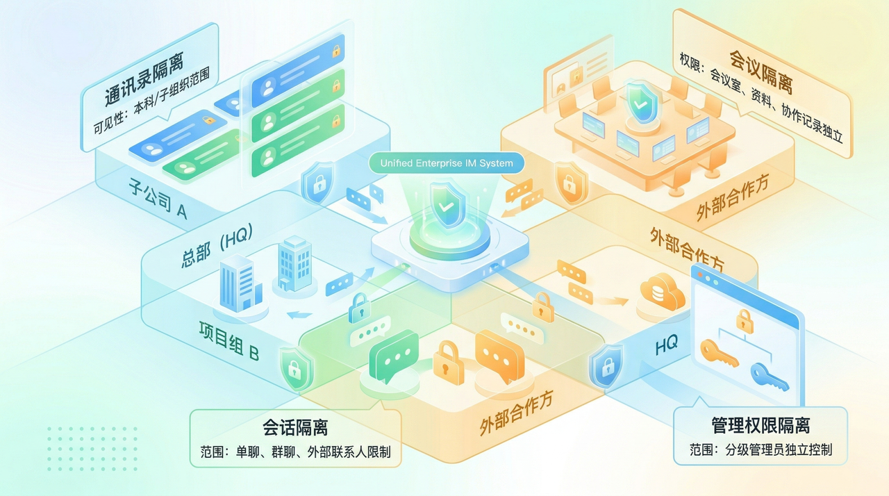 企业在选择即时通讯系统时,往往会优先关注单聊、群聊、文件传输等基础沟通能力。但随着组织规模扩大,子公司、项目组、合作方等多方陆续接入同一平台,可见范围、沟通权限和数据管理都会变得异常复杂。如果系统仍按单一组织、单一权限的逻辑运行,初期或许尚且够用,后期却极易暴露边界混乱、权限过宽、信息失控等严重问题。