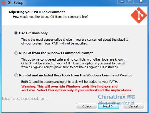 下载后进行安装,之前的步骤可以选择默认,到下图步骤时请选择 Use Git Bash only