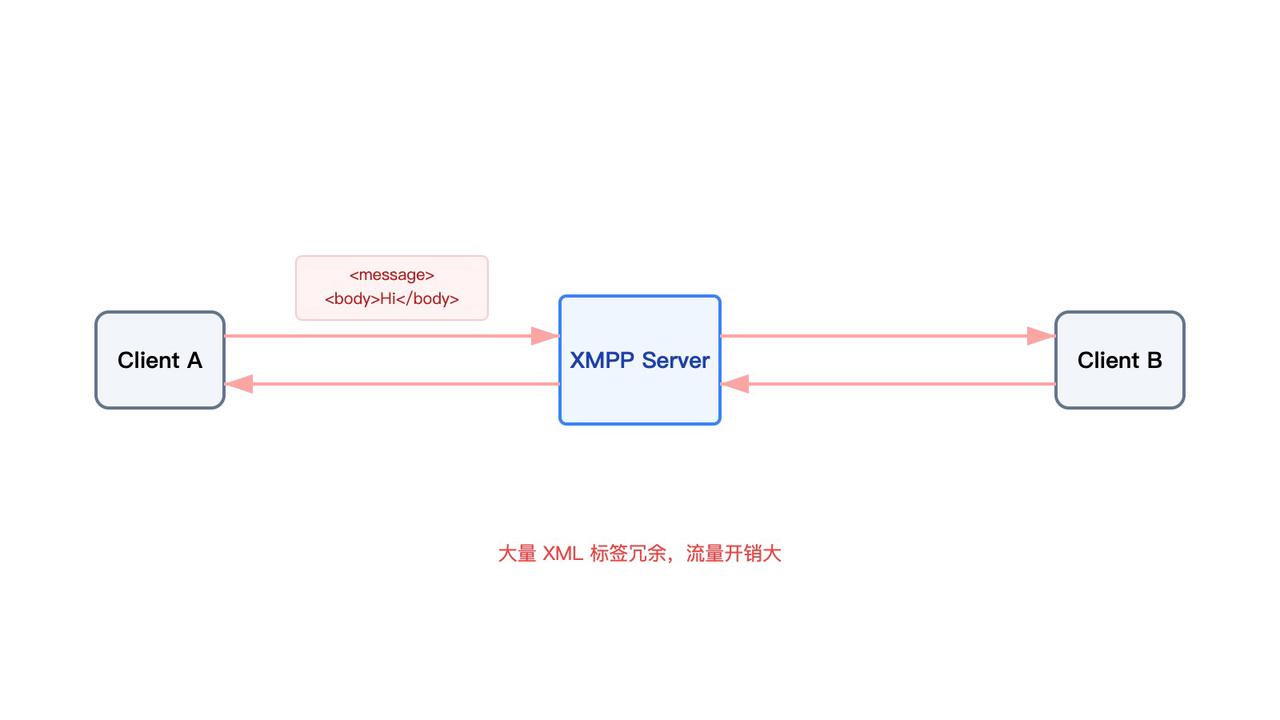 XML 本身极度冗余,在移动网络环境下,真正的业务数据往往只占消息体的一小部分,大量流量被消耗在标签结构上。更现实的是,XMPP 的连接建立和重连成本偏高,在移动端弱网和后台场景下,非常不友好,耗电问题尤为明显。