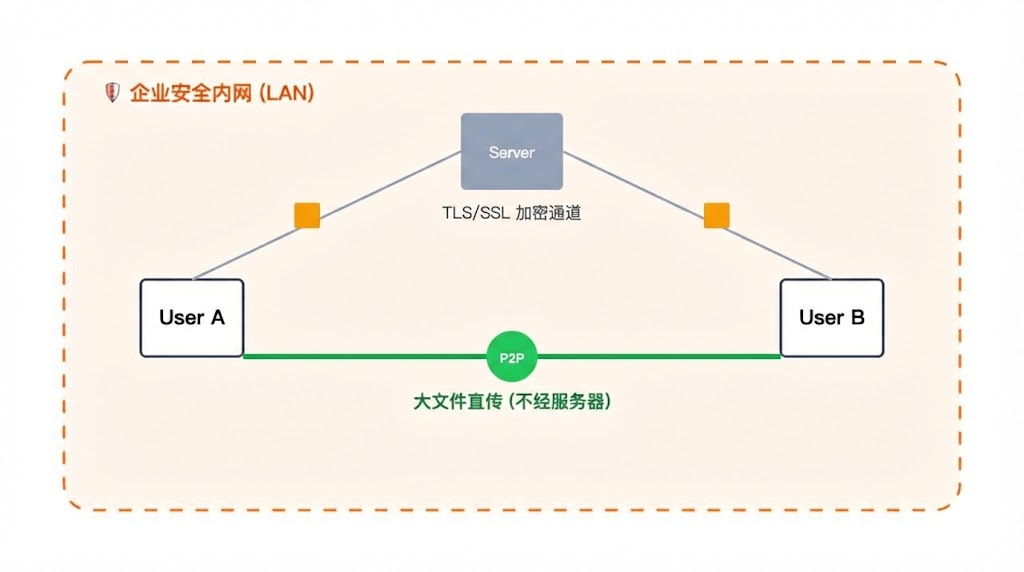 在内网环境下,喧喧还引入了 P2P 文件直传机制。大文件不再经过服务器中转,而是在同一网段内点对点传输,速度可以直接跑满内网带宽,同时不消耗服务器资源。这类能力,往往是企业级 IM 与消费级产品之间的关键差异。