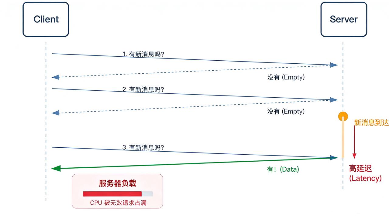 早期不少聊天室采用 PHP 或 Java 的轮询模式:客户端定时向服务器询问是否有新消息。