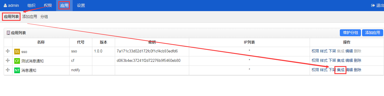 开启应用集成:在应用管理列表进入集成设置页面,启用集成功能,并获取生成的密匙: