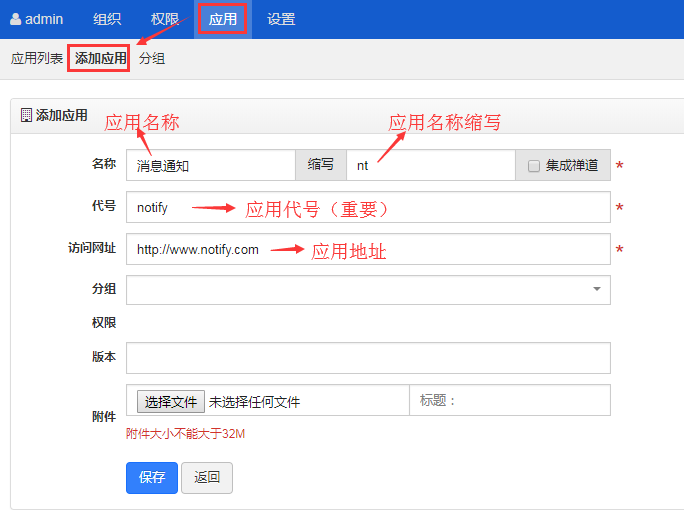 创建应用:如果还没有添加过应用则需要先创建一个应用,方法是打开后端管理界面(xxb),进入“应用→添加应用”页面: