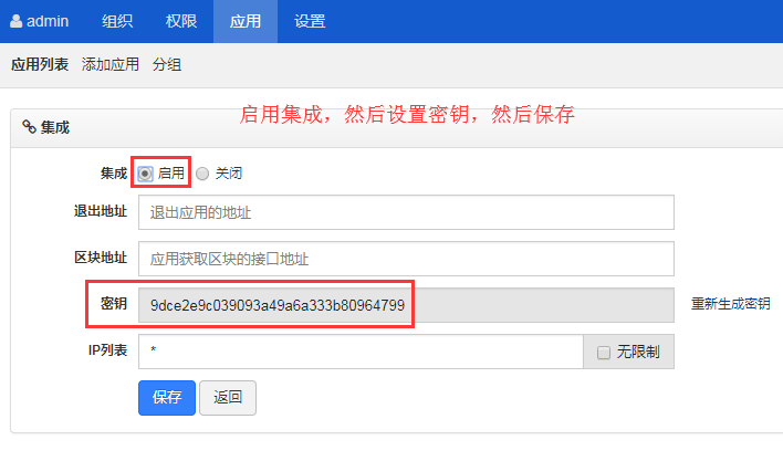 开启应用集成:在应用管理列表进入集成设置页面,启用集成功能,并获取生成的密匙: