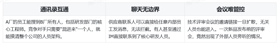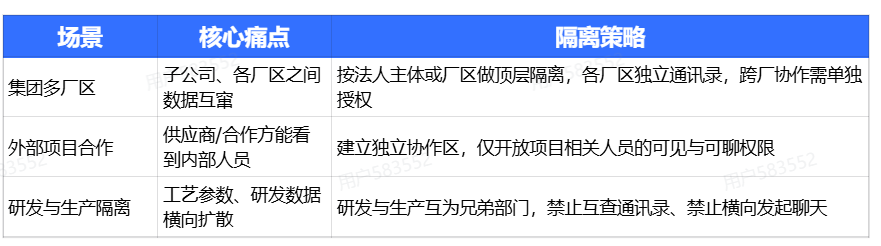三个维度相互配合,构建起一套从通讯录、到会话、到会议的 全链路隔离体系。