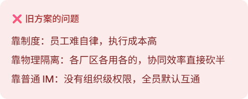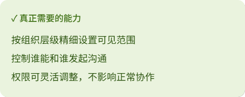 当一套 IM 工具能在组织架构层面就做好隔离,员工不需要记任何规定,系统自动守住边界。